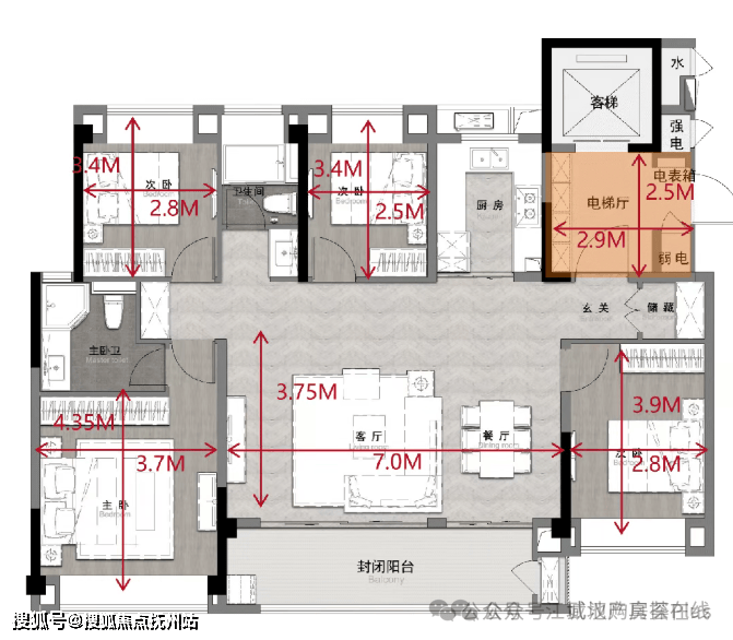 结合目前在售情况,项目在售最小面积就是100平三房户型。