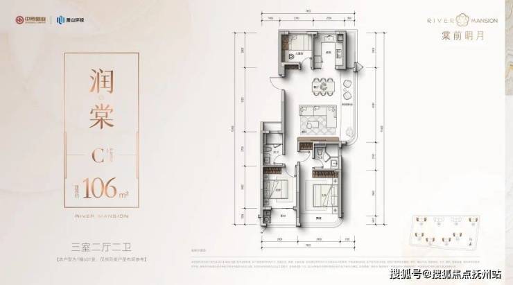 建面约106方三房两卫: