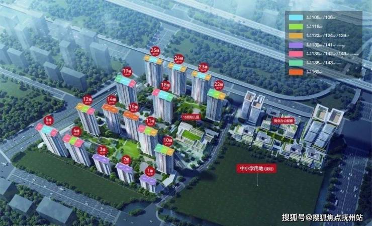 建发·云城之上规划16幢小高层➕高层住宅,包含1幢11F、2幢17F、3幢25F、10幢26F,以及5幢4-20F商业办公楼和1座幼儿园。
