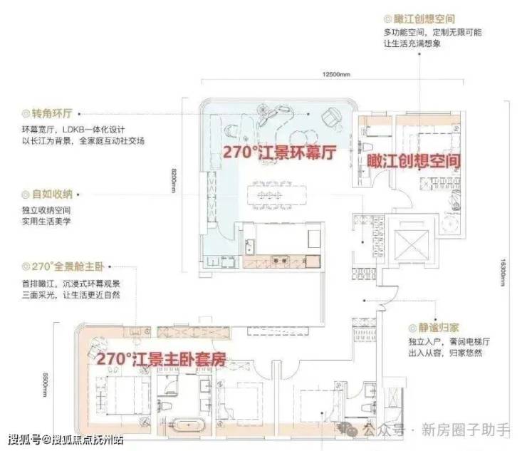 做出了约40㎡江景环幕厅+瞰江创想空间+270度瞰江主卧的无敌配置,是武汉楼市罕见的双全景舱观江户型。