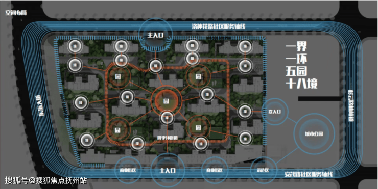 社区采用人车分流设计,在景观规划上,上实望海采用“一界一环五园十八境”景观法则,侧写九大生活场景。