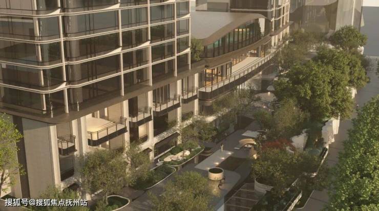 项目首层抬板设计,利用地库整体抬升约2.7米,形成场地高差,创造出4层观江会所与3层架空花园的独特空间效果,以超前手法重构“一楼一岛景、浮岛花园”的独特居住体验。