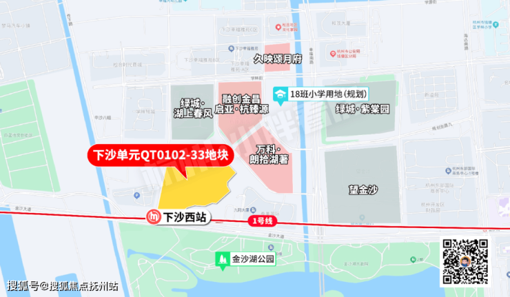 今年1月14日,绿城以201291万元的总价,2.344万/平的楼面价,41.5%的溢价率,高价竞金沙湖北面核心地块,地块名曰:下沙单元QT0102-33地块;也就是现在的绿城湖映金沙轩项目。