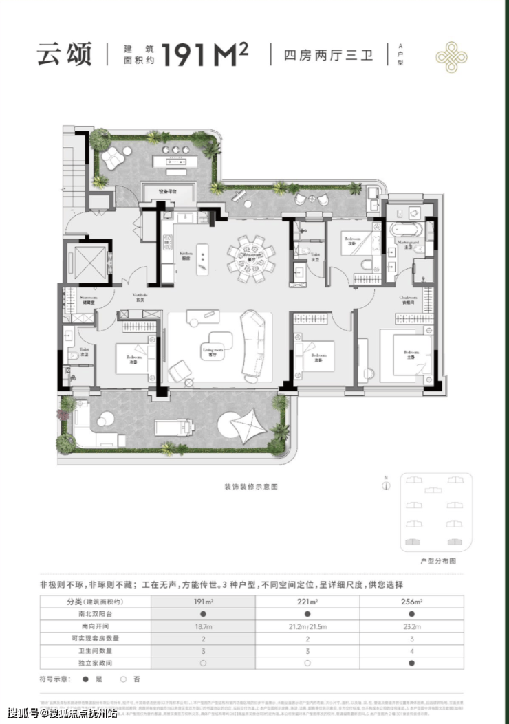 这是一个纯粹的圈层社区,仅195席。它带来的不是简单升级,而是彻底越级。项目以建筑面积约191~256㎡的科技四代宅,用舒适、绿色、节能、智慧四大维度和阔尺空间美学,重新定义了苏州湾的人居标准。南向最大约13.9米巨幕露台、双阳台、空中花园,全面重塑精英生活范本。