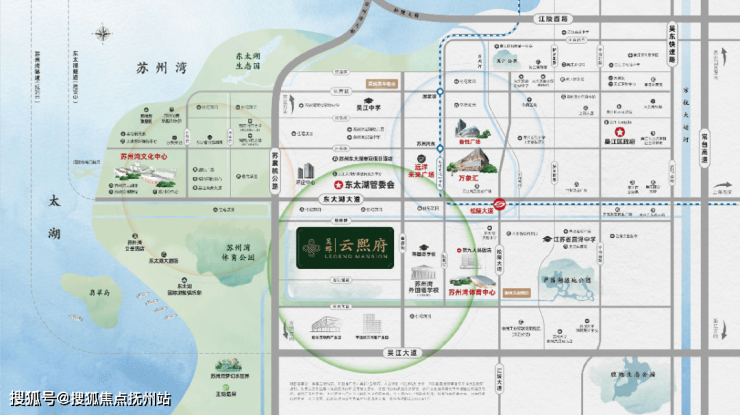 住在这里,生活半径内应有尽有。 生态:坐拥东太湖生态园、苏州湾体育公园,约50平方公里纯住区,推窗即景。 政务商业:紧邻吴江太湖新城管委会,万象汇、吾悦广场等商圈近在咫尺。 文体艺术:阅湖台、音乐喷泉、苏州湾文化中心、大剧院,信步可达。 交通:地铁4号线、东太湖大道环绕,东太湖隧道(建设中)、苏州湾隧道(规划中)未来可期。 教育:苏州湾外国语学校、苏州湾实验初中等12年制菁英名校环伺。 医疗:距苏州市第九人民医院约1公里,优质医疗为健康护航。