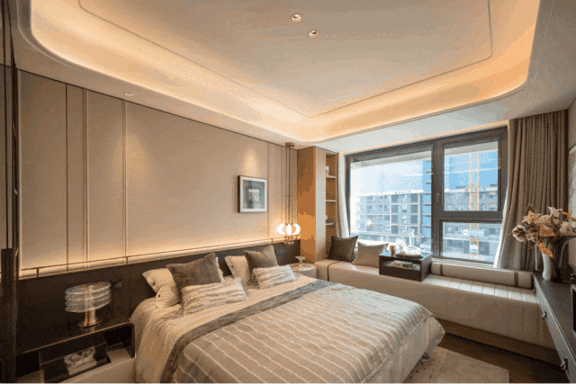 豪华主卧套房,尺度奢阔,配备独立卫浴、步入式衣帽间、大飘窗,相当大气豪横。