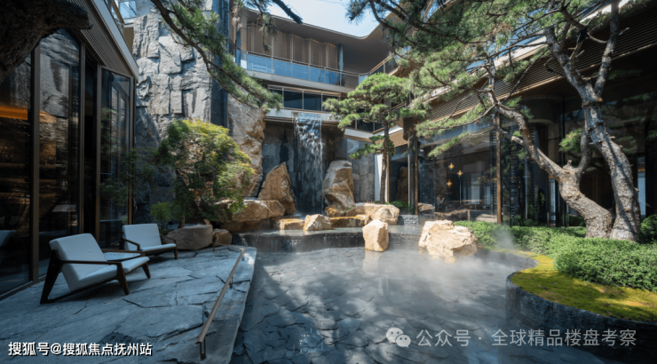 景观中庭的设计是市面上极为少见的三层观景式设计,以北宋画家范宽的《溪山行旅图》为范本,叠石、壑松及高低落差约15米飞瀑,亭台楼阁、檐下的游廊、小桥流水相互映衬,宛如一幅山水画卷。