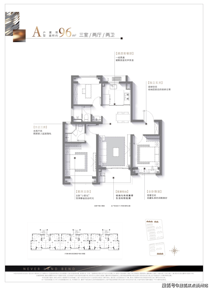 而建面约100㎡的三房两厅两卫户型,可以说是约96㎡3房的升级版,空间更加延展,整体横厅面宽约5.2米(轴中距),形成更大的南向采光面,且搭配南向观景阳台,直接做到了3.5面宽朝南,这在同类产品中是比较少见的。