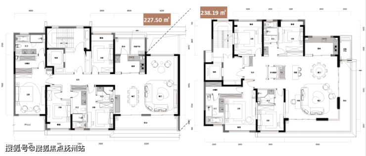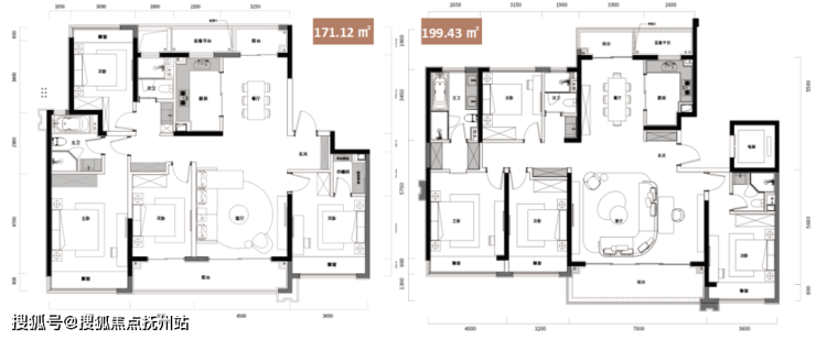 其余户型也各具特色,149.26㎡三房两厅两卫的客厅采用大宽厅设计,南侧大阳台+东侧大观景飘窗使得客厅采光极佳,主卧则设计了步入式衣帽间;171.12㎡四房两厅两卫和199.43㎡四房两厅三卫拥有更宽阔的开间,彰显业主尊贵气度;227.50㎡四房两厅三卫的南向面宽约20.8米,客厅约6.3米挑高、约8.2米开间,业主可享受别墅级生活尺度,同时还采用了中西双厨设计;238.19㎡四房两厅三卫为方正大平层,拥有约18.8米的南向开间,270°大转角风景阳台让业主享有全景视野,同样采用了中西双厨设计。