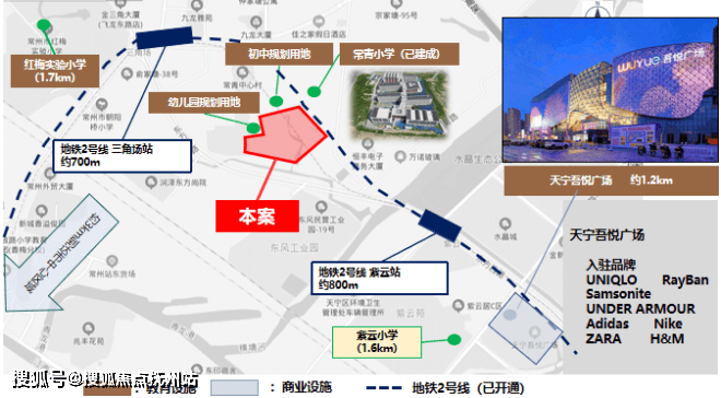 大和玖越项目位于常州天宁核心城区,区位条件优越。交通方面,约700m可达地铁2号线三角场站,约3km可达常州站,周边被两条高架环绕,东北方向1.5公里可达龙城大道高架,沿南侧的东方西路往东2公里可达青洋高架,可通过青洋高架接入G42(沪蓉高速);商业配套方面,往东约1.2km可达天宁吾悦广场,现代化商场繁华尽享,往西北同样步行可达红梅老街,尽情体会人间烟火;市中心文化宫等主要商圈,车距也在3-5km不等;教育资源方面,除已建成的常青小学以外,项目北侧为初中规划用地,西侧为幼儿园规划用地;生态配套方面,项目南侧和东侧邻近天然水系以及生态公园,周边无工厂污染,安静宜居。