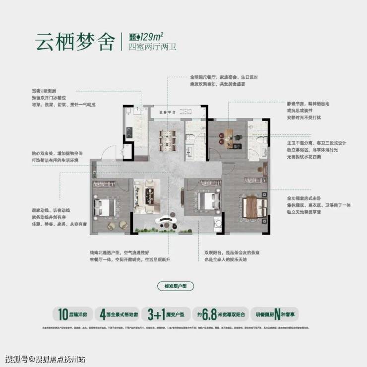 户型采用3+1灵动魔变格局,可根据家庭结构变化灵活调整空间功能,满足不同阶段的居住需求;四面全景落地窗设计,最大化引景入室、引光入内,让室内时刻充盈自然光影;约6.8米宽境双阳台,兼顾生活晾晒与观景休闲双重需求,让日常起居皆能拥揽宽幕视野,实现一步到位的品质进阶。