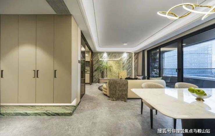 承载着每一段平常时光的餐客厅,更是格调高雅,奢配香格里拉翡翠岩板电视机背景墙;双层吊顶装饰以石膏板与灯带,简约而端庄。美学感尽显的同时,细节亦不乏臻至,予生活恰如其分的温度: