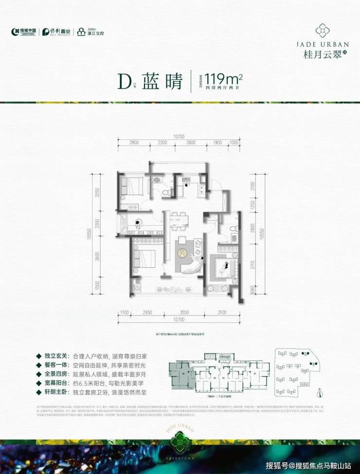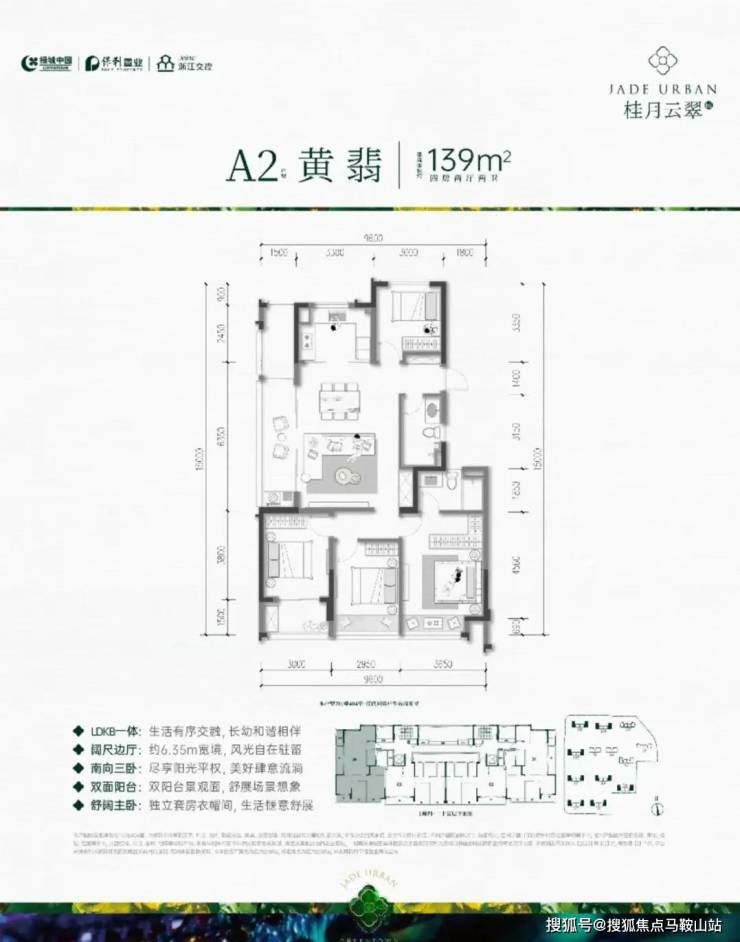 A户型:约139㎡户型,四房两厅两卫,三开间朝南,全明边厅设计,大横厅带大阳台,采光视野好;三个卧室均朝南,带阳台或飘窗,面宽大、采光好;主卧大套间、阔绰收纳空间。是绿城过往的项目中难以见到的。餐客厅一体,连带一个约6.35m左右阳台,景观视野堪称一流。