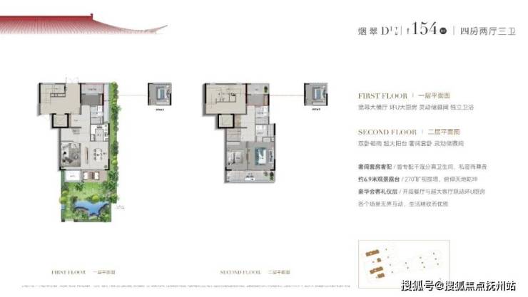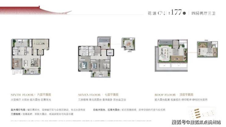 比如建面约170㎡的双层下叠四房两厅三卫,约9.7米面宽,三开间朝南的大四房格局。约6.9米面宽,两房朝南;南向房间一字拉平,北向也设置房间,但确保每一层空间,与院落、阳台或露台衔接,迎接漫天漫地的阳光与月光。