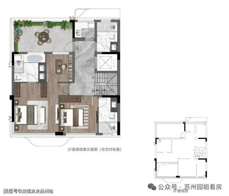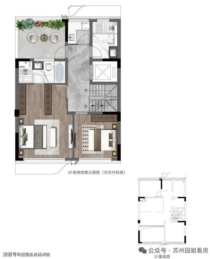 二楼朝南套房+朝南次卧,预留客卫+家政间,朝北带露台;