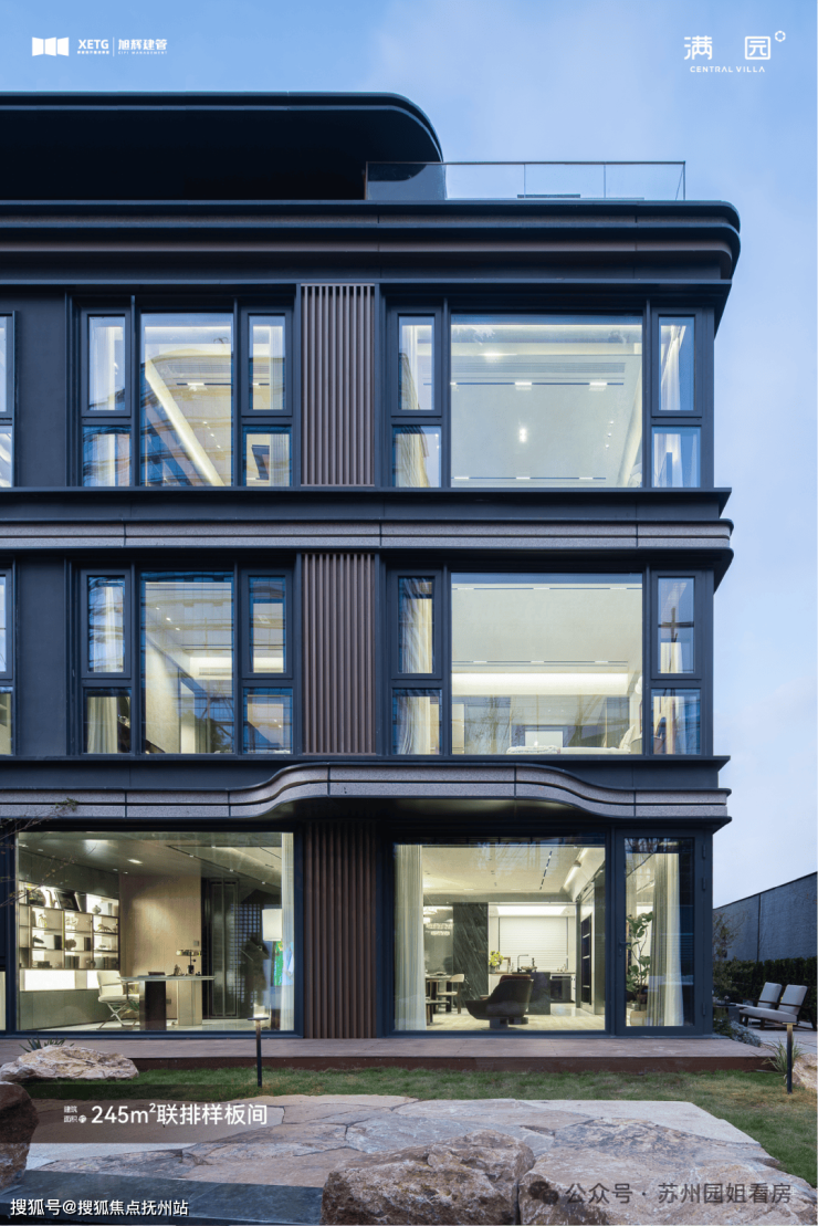 外立面也非常出挑,尤其是联排,大面积落地玻璃搭配270度转角窗,以及香槟金+银色铝板线条勾勒,极具辨识度。