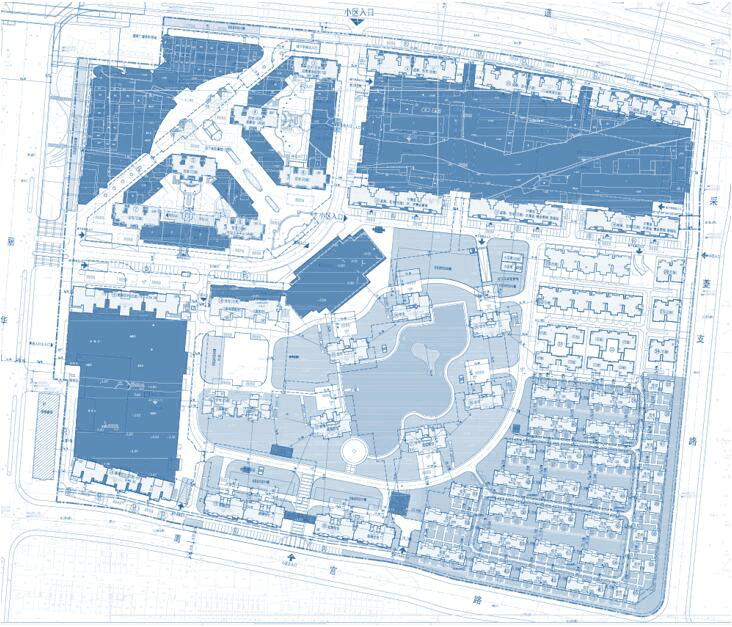 项目由多个裙楼组团组成,组团之间形成了多条街道动线,由于街区皆为室外动线,且缺乏防风挡雨设计,在冬季及雨季,人流难以在室外行走。