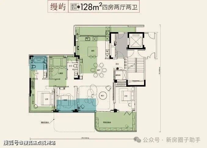 建面约128平四房两厅两卫真四代:不含电梯前室,优化后得房率约133%!