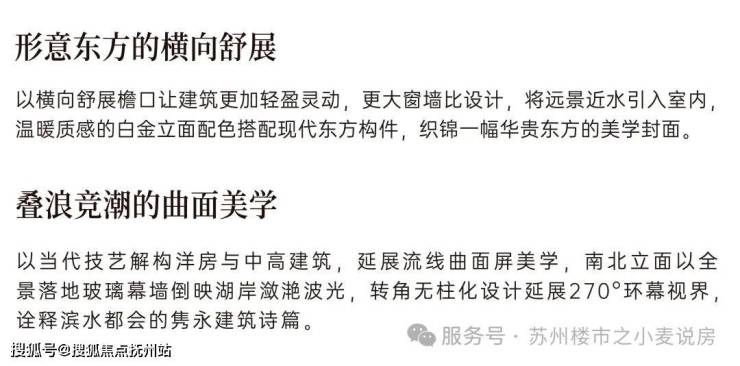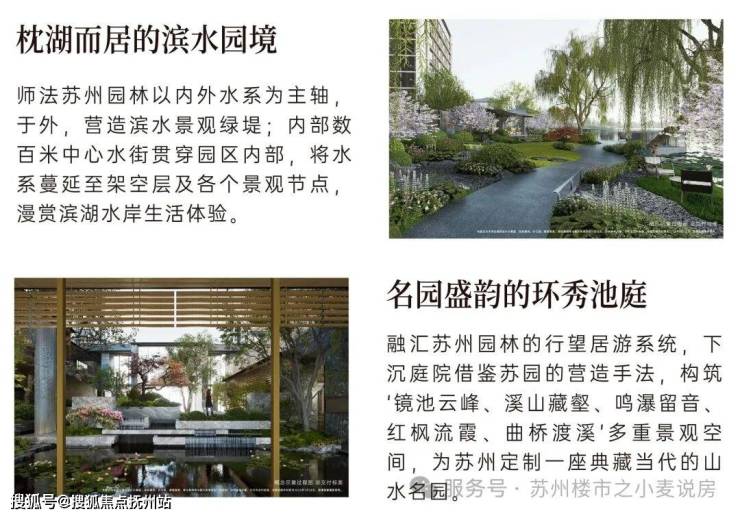 依凭半岛三面水岸的天然资源,以“一堤三面湖”和“水街襟两园”设计笔触,实现滨水互动、开门见水的场景体验;融汇吴门画派、苏州园林造园理念,营造出一座温润如玉的流动庭园。