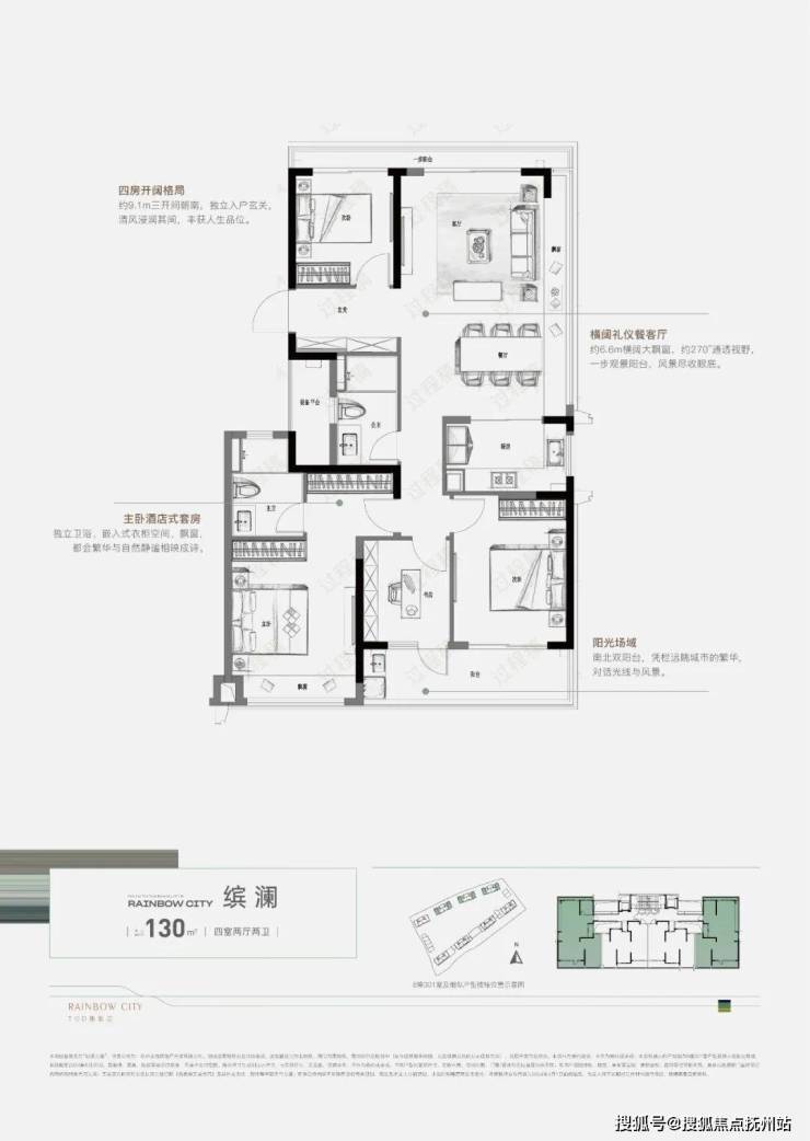 而建面约130㎡户型,在纯边套、约270°环景视野的基础上,餐客厅配以约6.6m横阔大飘窗、一步朗阔阳台,瞰景收心,释放恬淡自在的情绪。约9.1m三开间朝南,约5.6m双联阳台,无限扩展生活意境,园林芳华尽现眼前。一方阳台亦可作为私人天地,一台跑步机或瑜伽垫,即刻打造一个健身房;一副休闲桌椅,亦可感受生活的自如惬意。
