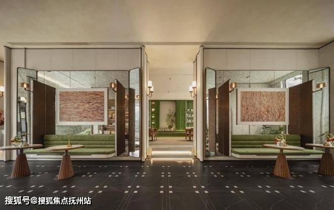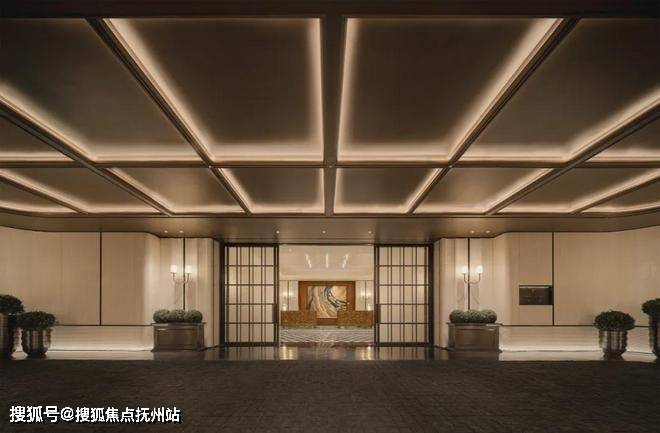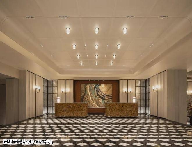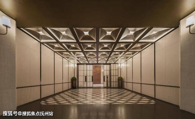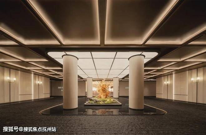 步入门庭,云石吊顶之下,借鉴中国古代建筑中的“藻井”做法,由522片皇家白玉石材拼接而成,凝聚光华,辉映时空。华光之下,中心水池承托起艺术雕塑,莹润皎洁,宛若珍宝。立面则采用铂金钻奢石,搭配墨绿荷塘月色奢石、安哥拉黑奢石花钵、以及手工锻造的巨幅铜门,流淌出一抹温润质感。