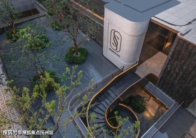 下沉庭院位于生活馆与后场庭院之间,以超过7.5米的高差形成台地花园。红枫、斜飘紫薇等花木密植,绿意葱茏,四时更迭。三层叠水流泻而下,伴随着潺潺水声,涤荡心灵。阶梯步道、休憩平台沿无边水池巧妙布置,曲折有趣。俯仰之间,天地已沁入身心。