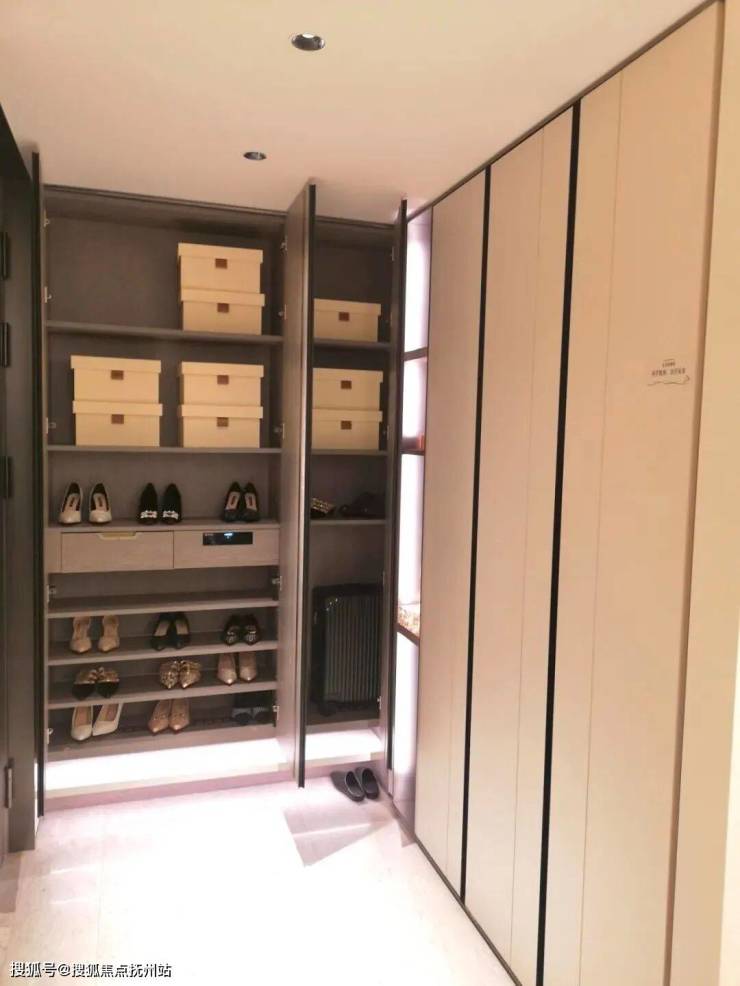 极致收纳。玄关处,定制了两面墙的收纳玄关柜。玄关柜内配有“灭菌精灵”,能够消杀衣帽鞋子上的细菌。容量方面它可以放60双鞋、20个整理盒、4双高筒靴、4把雨伞、3个手提包、3件大衣。主卧、厨房与卫浴里,收纳空间也做到了极致。