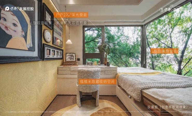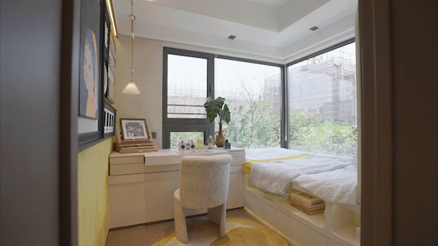 次卧实现 270°L型飘窗,双向窗户采光,可以轻松拓展出书桌及收纳空间,尺度感非常不错。