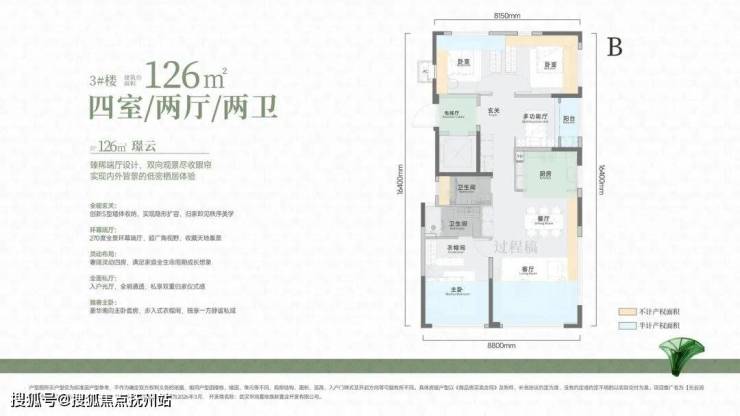 重点户型。这个面积段有两个版本:大面宽版和端厅版(带270度采光设计)。四房两卫,家里有老人同住或需要独立书房的家庭,这个户型非常实用。