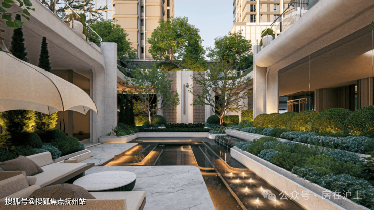 下沉式会所约1200㎡,配置恒温泳池、健身空间及私宴厅,结合水景与绿意,营造度假式生活场景。