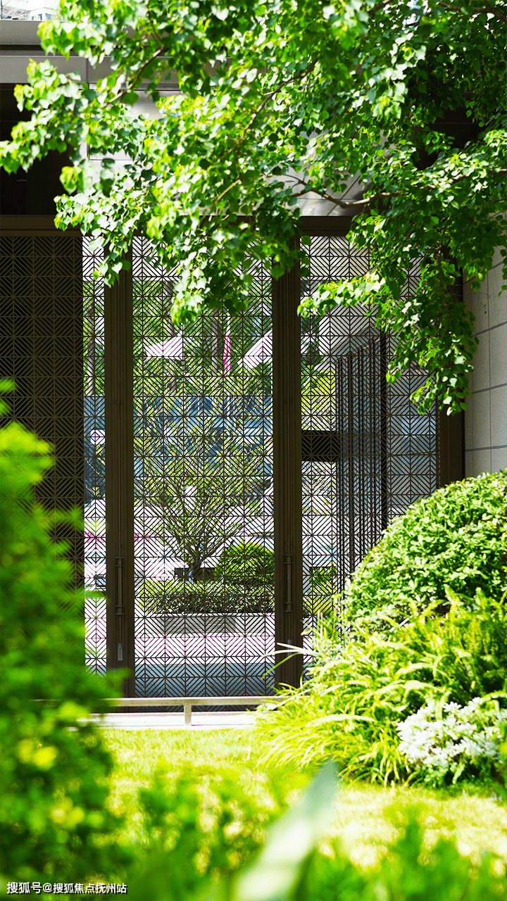 主入口门楼:约20米宽的典雅门楼气势恢宏,入口利用1.5米高差打造三层退台,台地边缘的灯带在傍晚次第亮起,如同铺就的星光大道。门楼内专属定制的金属格栅勾勒出老汉口建筑的轮廓线条,与普拉达绿仿石材墙面相映成趣,门楼后的涌泉景观伴着归家脚步潺潺流淌。