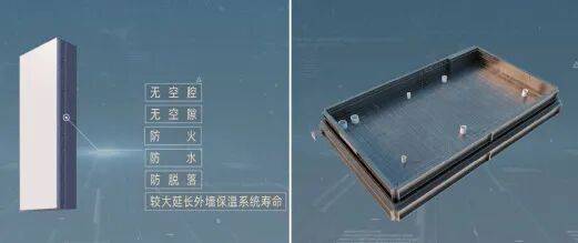项目摒弃传统保温工艺,建筑立面采用保模一体板与混凝土同步浇筑,100% 满粘结合,不但拥有 A 级防火、抗风防脱落、保温隔热等功能,外立面还能与建筑同寿命。
