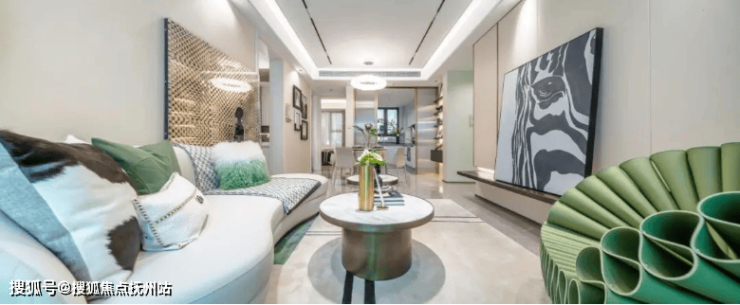 客厅和主卧都标配悬浮吊顶、无主灯设计,背景墙采用皮革和铝合金拼接,也都是实体交付的。