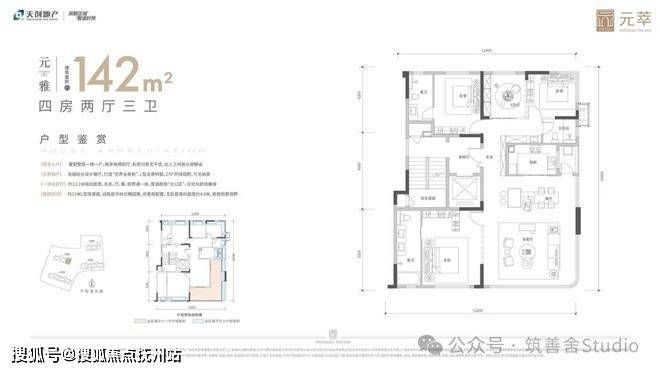 建筑面积约142平方米的四房三卫户型:边户配备独立电梯前室,南向拥有超大阳台与大花池,两个卧室更可享受双面飘窗设计,空间利用率极高;北向多功能空间同样设有飘窗、空调机位及设备平台等优化配置。