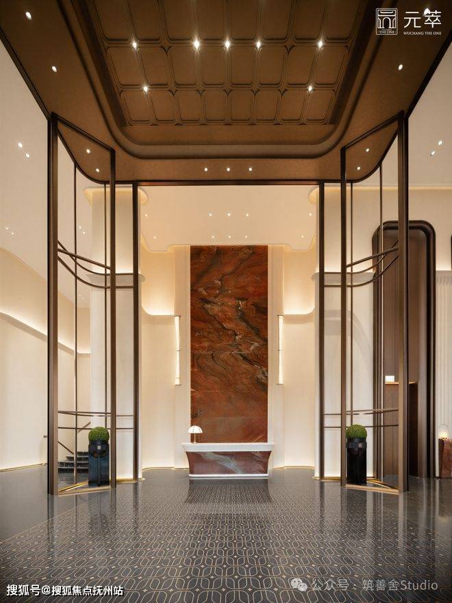 门前纯古铜鎏金水波纹,由数十位非遗匠人历经80000锤非遗錾刻淬炼而成。以西式造型,融入东方意境,非遗匠人手工凿刻“引水琢玉”,匠心独运。