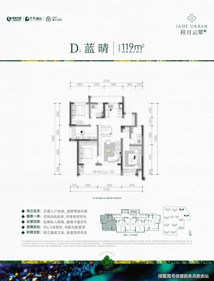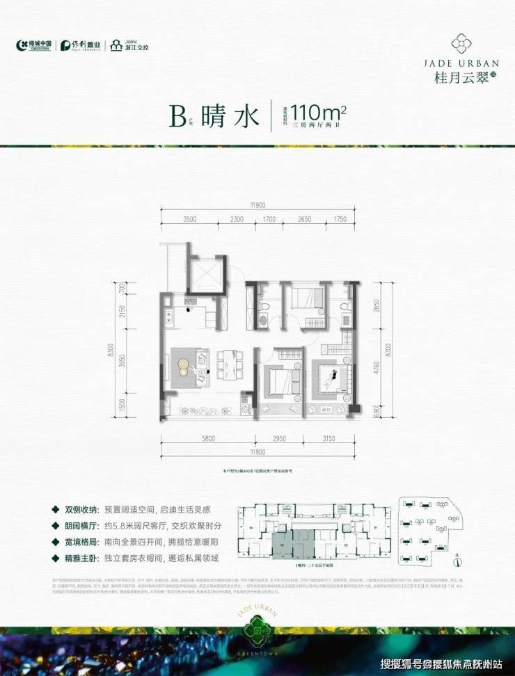 A户型:约139㎡户型,四房两厅两卫,三开间朝南,全明边厅设计,大横厅带大阳台,采光视野好;三个卧室均朝南,带阳台或飘窗,面宽大、采光好;主卧大套间、阔绰收纳空间。是绿城过往的项目中难以见到的。餐客厅一体,连带一个约6.35m左右阳台,景观视野堪称一流。