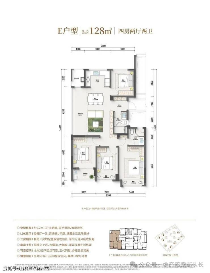 128平米户型:尊享四室两厅双卫设计,配备独立玄关,宽敞横厅边套布局,三卧室均朝南,配备生活阳台与休闲阳台(全包),拥有近16米超宽采光面,让您的生活充满阳光与温馨。