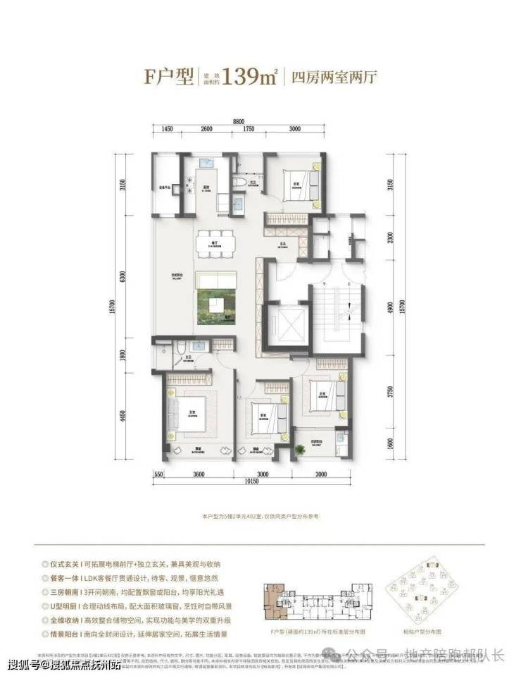 139平方米户型:两种户型一是四室两厅双卫,设有独立玄关,宽敞横厅边套设计,三室朝南,配备全包式双独立阳台。二是四室两厅双卫,配备独立玄关,南北通风顺畅,四开间向南,配备全包式双独立阳台。
