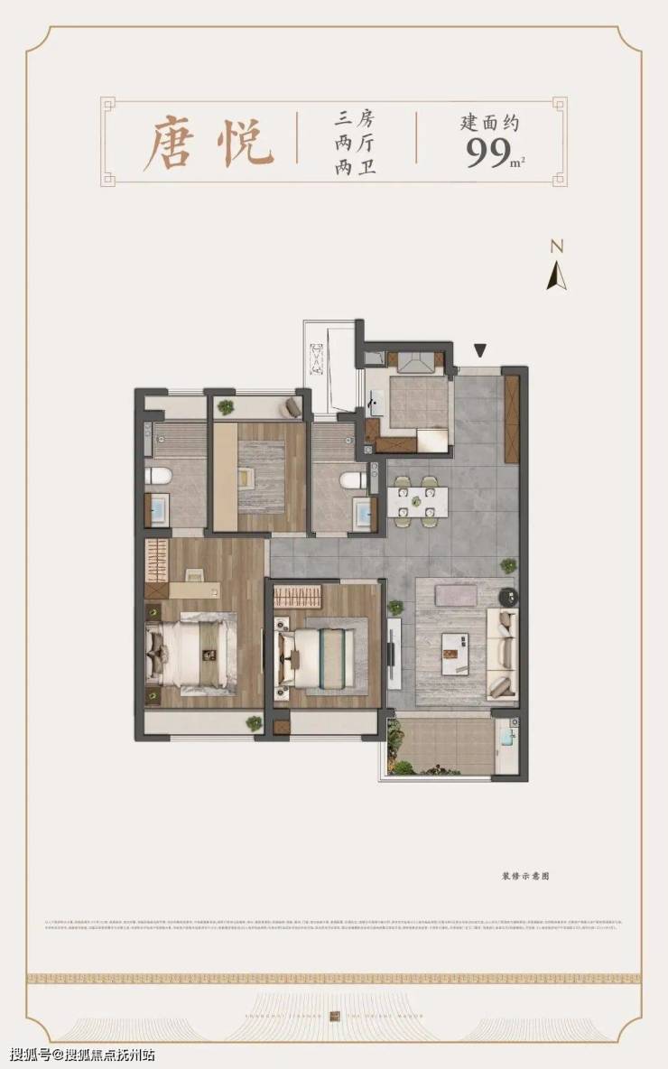 约99㎡3房2卫,汇聚了市面上优秀户型应该有的大多数特质。