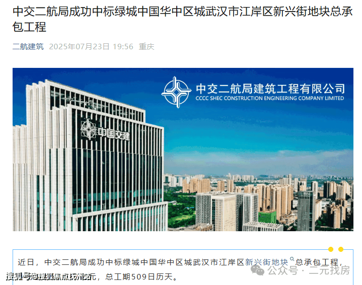 7月23日,二航建筑发布推文,宣布中标绿城中国华中区城武汉市江岸区新兴街地块总承包工程,总工期509日历天。