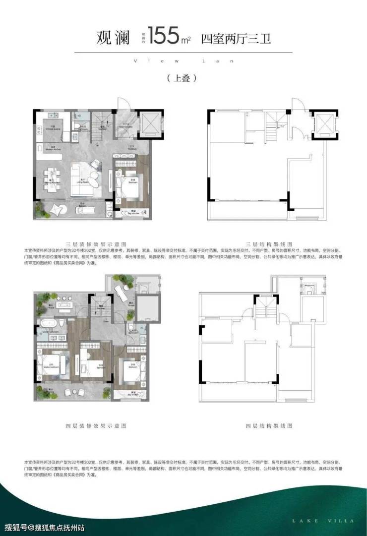155平叠墅(四房两厅三卫) 约6.75米的景观宽厅,让室内充满阳光。朝南的老人房关怀备至。厨房空间灵动,也可实现中西厨分离。主卧拥有约3.85米开间,可打造为酒店行政套房般的舒适空间。