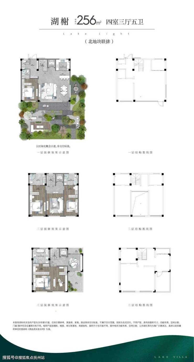 256平联排-北地块边户(四房三厅五卫) 拥有独立入户门厅,归家仪式感满满。三面宽的设计让空间更灵活。朝南的老人房阳光充足,使用便捷。主卧套房采用酒店式设计,预留了独立卫浴空间。