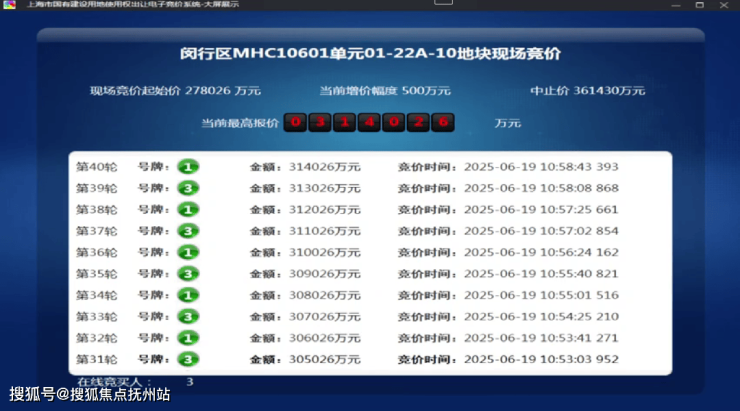 6月19日,闵行1幅地块出让,地块名称为颛桥镇MHC10601单元01-22A-10地块,规划用地性质为住宅用地,出让面积4.05公顷,容积率为2。经过40轮竞拍,最终由上海保利城市发展有限公司竞得,总成交价314026万元,溢价率12.95%。