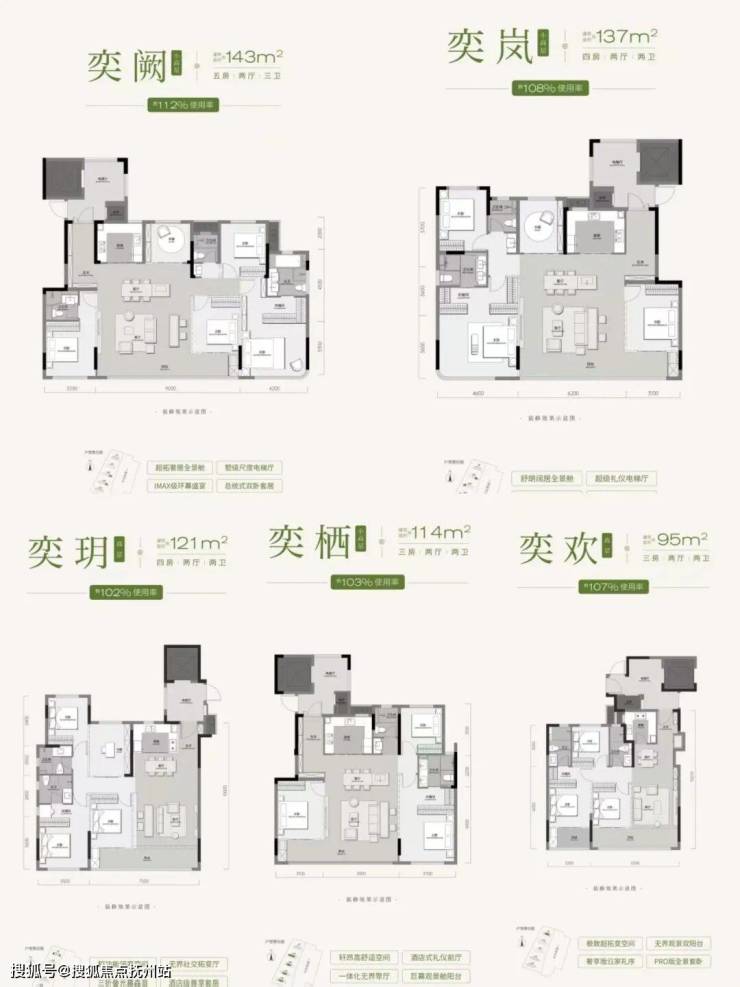 天创-云和奕项目分两期开发,其中一期:5栋11-26层住宅,335户,户均建面116平。一期1#1个单元26层,2、3、4#二个单元都是17层,5#二个单元11层 。都是第四代住宅设计,容积率低,最高得房率约112%,全2T2户配置专梯入户。95-143的面积段都有户型图如下