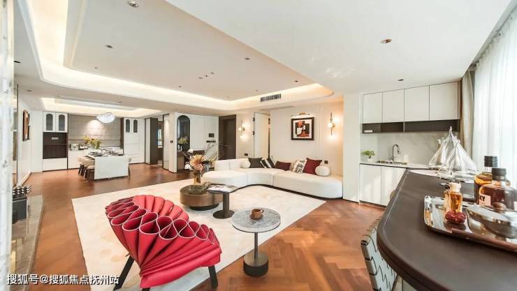 LDKG一体式厅堂内,女主人可以在中西双厨岛台插花,男主人倚靠南向阳台阅读,孩童在客厅地毯堆积木,三者视线可交错却互不干扰。