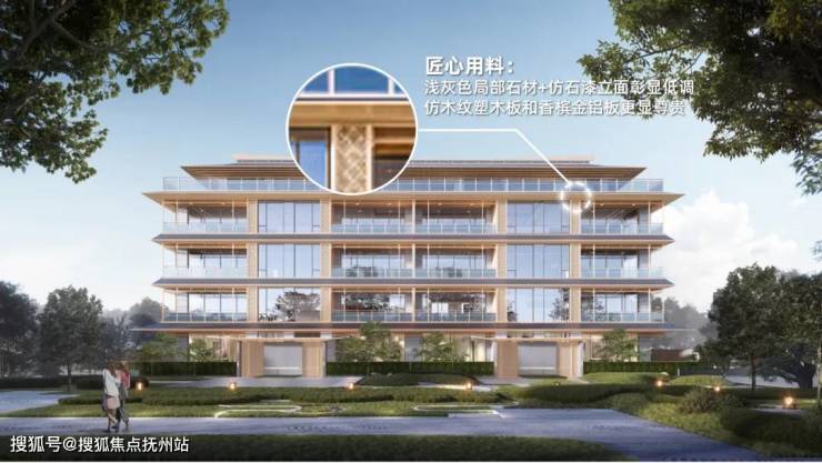项目采用浅灰色局部石材+仿石漆立面彰显低调,仿木纹塑木板和香槟金铝板点缀,灰色中式坡屋顶、经典三段式立面设计,线条简洁优美。
