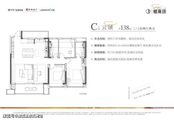 建面约138㎡整体3+1房+南向三开间+双卫的格局设计,更是让这个户型自带尺度感、舒适度、尊崇感。