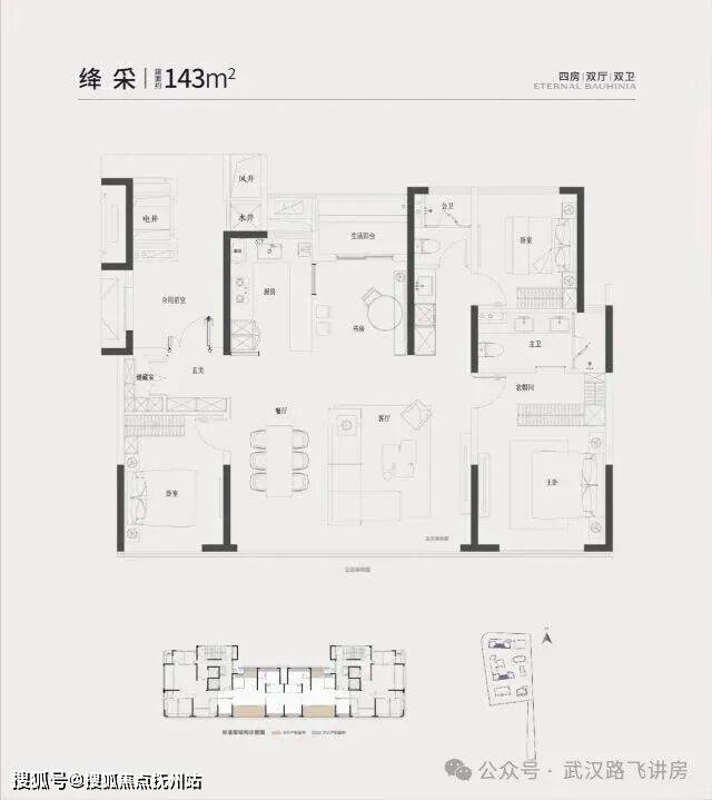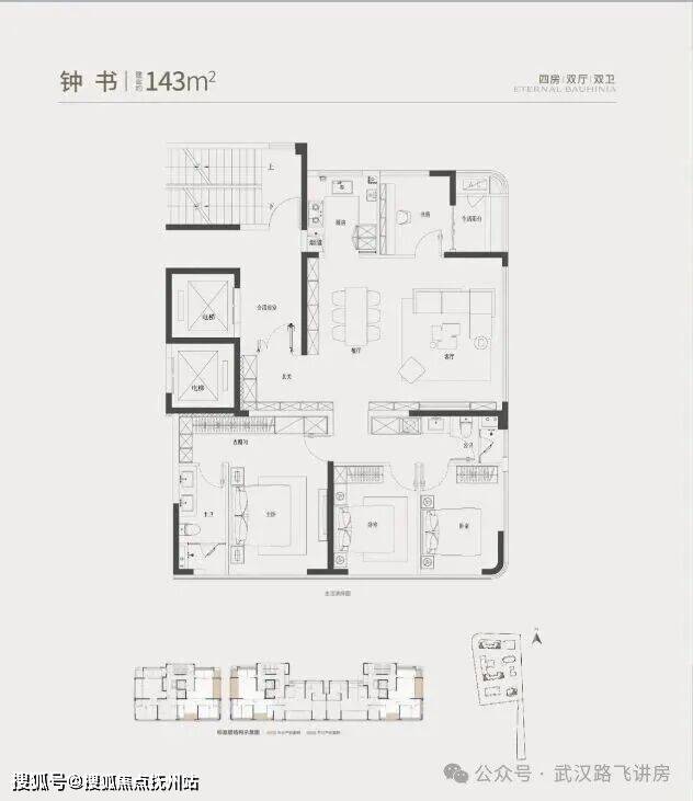 ①钟书143㎡户型:四房两厅两卫:拥有三面采光优势,分布在1、3号楼的纯边户以及4号楼。该户型餐客一体区域朝东或朝西,且与东西向的封闭式生活阳台相连;三个卧室均朝南,其中主卧面积格外大,几乎是另外两间卧室的面积之和。北向则规划了实用的开放式生活阳台、一间多功能房和一间厨房,个人觉得厨房面积和开间都偏小,但好在厨房与外侧一整面墙体相连,具备改造成中西双厨的条件。