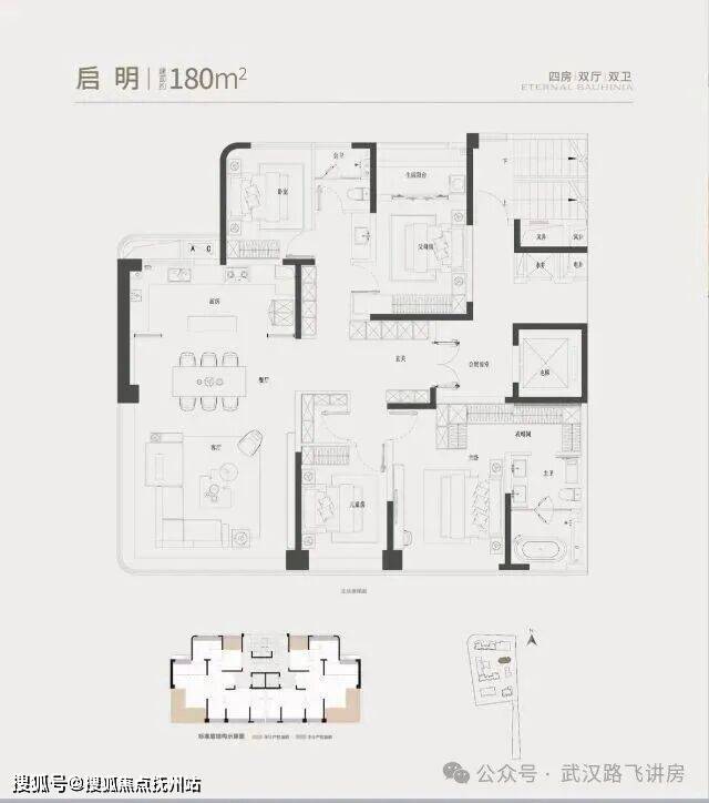 ③启明180平户型,四房两厅两卫:位于 2 号楼,同样规划为四房两卫格局。因户型实现三面采光,所以将 LDKB 一体化空间设置在东西向,并搭配 270 度封闭式阳台,主打观景功能。2 号楼处于小区内部,不靠近主干道,其中西边户能欣赏小区园林景观,东边户的景观视野则相对逊色。该户型的主卧空间规划得格外宽敞,这一点我个人比较认可;南向还设计有一间书房,北向则分布着两间次卧、一个公卫,以及一个开放式生活阳台。