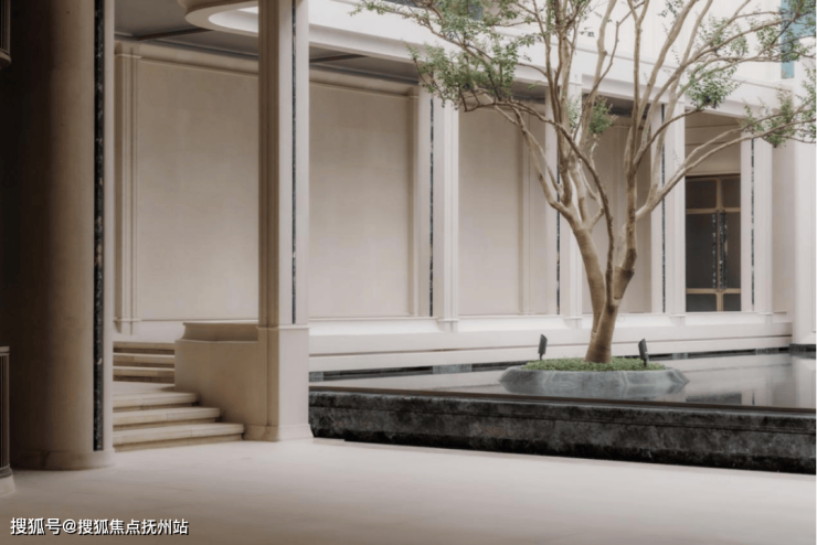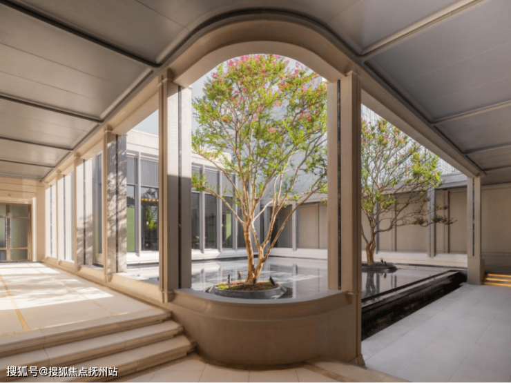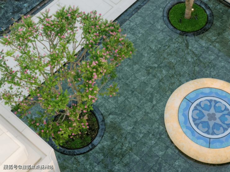 老桩紫薇对植,翡翠蓝石材水景倒映天光,形成浮光掠影的艺术画面。